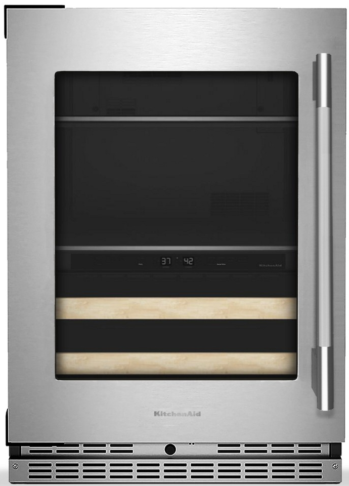 This 24" Undercounter Beverage Center with Full-Extension Wood-Front Racks stores 14 wine bottles below with room for drinks and food on the full-width shelves above. Two Temperature-Controlled Zones adjust for what you’re storing, and a Temperature Monitoring System with sensor alert adds peace of mind. Fully Flush Installation with Hidden Hinges provides a built-in look within cabinetry.Read More