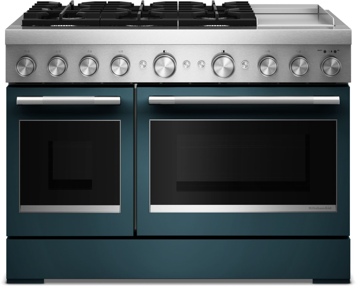 Satisfy your craving to create with a 48-inch KitchenAid® Commercial-Style Range with Chrome Electric Griddle. This dual fuel range combines an electric double oven with a 6-burner gas cooktop. Two 20,000 BTU Ultra Power™ Dual-Flame Burners offer power and precision to successfully sear, simmer, stir-fry and sauté. Even-Heat™ True Convection gives consistent baking and roasting, plus air fry mode that yields crispy, golden results.Read More