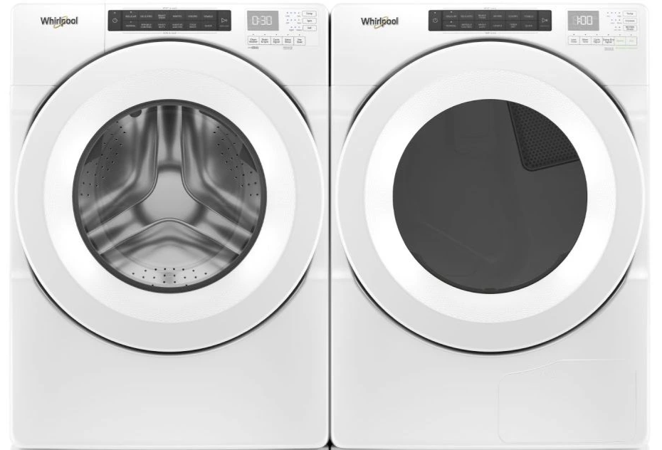 Whirlpool® White Front Load Laundry Pair with a 4.3 cu. ft. capacity washer and a 7.4 cu. ft. capacity electric dryer.Read More